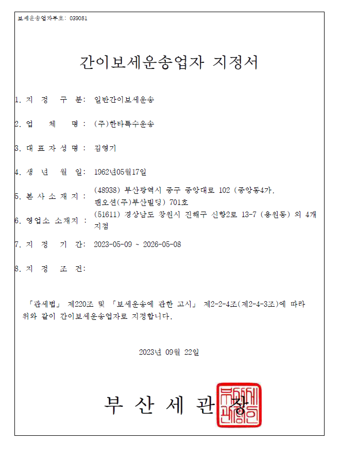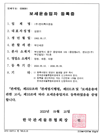 < 보세운송업 등록증 >